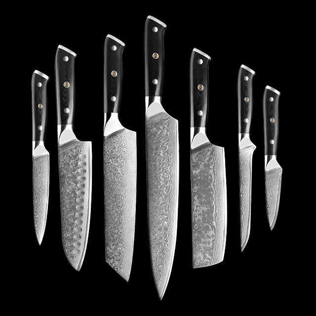 Nossas facas Damasco apresentam lâminas super afiadas, forjadas à mão a partir de aço Damasco japonês de 67 camadas VG10 com uma dureza de 62±1 HRC. Experimente a nitidez extrema de longa duração que torna cada corte uma brisa.